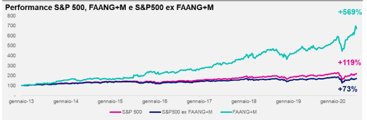 Grafico 1: performance di S&P 500, FAANG + M e S&P 500 esclusi i FAANG + M
