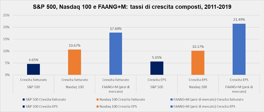 Grafico 4: Tassi di crescita di fatturato e utili di S&P 500, Nasdaq 100 e FAANG + M