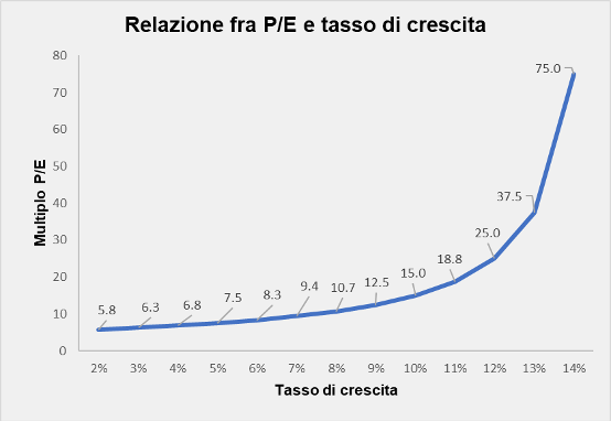 Grafico 5: Relazione fra multiplo P/E e tasso di crescita