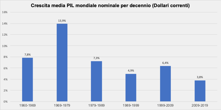 Grafico 6: Crescita del PIL mondiale nominale per decennio, 1960-2019