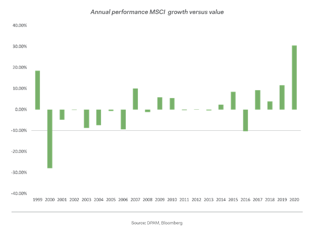 Il 2020 è stato un anno segnato da oscillazioni aggressive del mercato e il mese di novembre non ha fatto eccezione, anzi, tutt’altro. Anche se i livelli di volatilità non si sono avvicinati a quelli d’inizio dell’anno (quando ha colpito la prima ondata del virus), le quotazioni azionarie sono state estremamente irregolari nelle ultime due settimane. Due eventi che hanno abbassato la percezione del rischio si sono susseguiti, causando significative rotazioni di settore. E questo è accaduto in un contesto di mercato azionario polarizzato che raramente si era visto prima. Come riferimento, vorremmo sottolineare le grandi dispersioni di performance all’interno del settore Global Industry Classification Standard (GICS1) che nel 2020 arrivano anche fino al 70% (come ne caso di IT versus energia) o la forte predominanza delle azioni growth durante la maggior parte del 2020.