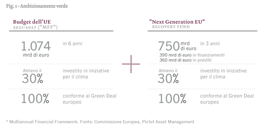 Innestare la quinta. È precisamente quanto ha appena fatto l’Unione Europea, scegliendo la rotta verso un’economia più sostenibile. Il suo nuovo piano per il clima prevede il taglio delle emissioni di gas serra del 55% rispetto ai livelli del 1990 entro la fine del decennio. Un obiettivo decisamente più ambizioso rispetto a quello in precedenza fissato dall’UE, del 40%, e significa che la regione potrebbe diventare a emissioni zero entro il 2050. Non è difficile comprendere perché l’UE sia così determinata nel perseguire un piano di rilancio “green”. Se ben eseguito, il piano offrirà l’allettante prospettiva di riportare in piena salute contemporaneamente ambiente ed economia. I fondi stanziati puntano senza dubbio in quella direzione. Il pacchetto si tradurrà in circa 7.000 miliardi di euro di nuovi investimenti “verdi” entro il 2050. Fondamentale per le prospettive economiche della regione, una gran quantità di quel denaro sarà convogliata nel settore ambientale (si veda Fig. 1), un settore in rapida crescita che sta apportando un contributo sempre maggiore al PIL. Il valore aggiunto lordo del settore ambientale – una misura del suo contributo alla produzione nazionale – è cresciuto a 286 miliardi di euro nel 2015, in crescita del 63% dal 2003. Questo settore, dove si trovano alcune aziende particolarmente vivaci, come quelle che si occupano della gestione delle risorse e che comprende le energie rinnovabili e l’efficienza energetica, è cresciuto del 150% nel medesimo periodo.