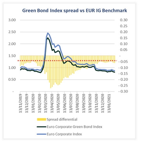 La distorsione fra la profondità limitata del mercato dei green bond e l’accresciuta domanda da parte degli investitori ha portato alla creazione di un premio di valutazione apparente, che noi chiamiamo “Greenium”. Di base, confrontando gli indici green con quelli tradizionali, potremmo parlare di un greenium strutturale medio di 4/5 punti base.