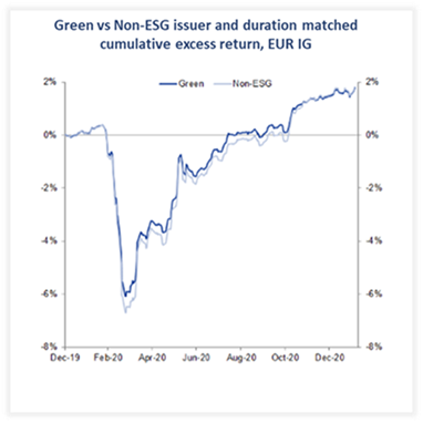 Tuttavia, quando confrontiamo “like per like”, cioè rendimenti comparabili degli stessi emittenti con obbligazioni della medesima scadenza “green” con omologhi “non-green”, non si può determinare alcuna sovraperformance statistica sistematica.