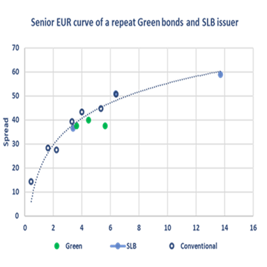Ciò che questo grafico non mostra è quello che succederà quando i SLB arriveranno a scadenza. A seconda che l’emittente raggiunga o meno i propri impegni sul clima, essi potrebbero pagare una cedola minore o maggiore, poiché tale cedola include un meccanismo “step up or down” alla scadenza a seconda che l’emittente riesca oppure no a raggiungere i propri obiettivi ESG.