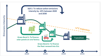 Vediamo diversi progetti finanziati con green bond in cui sono identificati gli asset che aiutano l’azienda a ridurre le proprie emissioni nel lungo termine. D’altro canto, notiamo che la moltiplicazione di progetti green ha lo stesso risultato dell’obiettivo fissato per i SLB (in blu), che avrebbe l’ambizione, in un periodo di 10 o più anni, di ridurre le emissioni di CO2 dell’azienda. Questo approccio SLB è simile a quello implementato da La Française nei portafogli Carbon Impact, per cui calcoliamo la “traiettoria auspicata” dei target di riduzione delle emissioni per ciascuna società nel medio e nel lungo termine. In La Française ci assicuriamo che questi obiettivi o progetti siano raggiunti e che siano abbastanza ambiziosi per raggiungere lo scenario che prevede un aumento della temperatura pari o inferiore a 2°C.