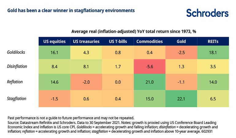 Per esempio, nelle fasi di stagflazione, i migliori performer sono stati oro (+22,1%), commodity (+15%) e real estate investment trust (REIT – +6,5%). L’azionario è invece in negativo (-1,5%).