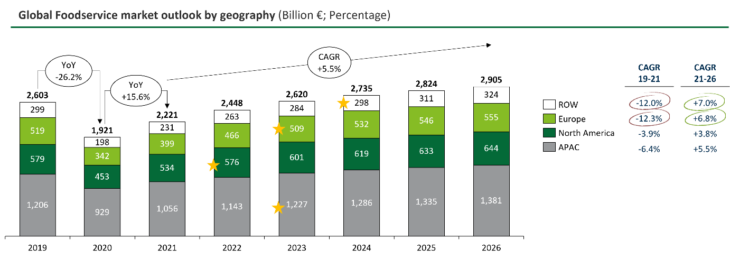 La flessione indotta dalla pandemia di Covid-19 negli ultimi due anni ha portato il mercato della ristorazione in Europa a contrarsi del – 12,3% (CAGR 19-21), un impatto più sensibile se confrontato all’esperienza dell’area APAC e del Nord America (rispettivamente -6,4% e -3,9% CAGR 19-21).