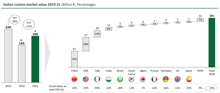 Nel 2021 ha sostenuto infatti una crescita a doppia cifra, pari al +25% rispetto all’anno precedente, che ha risollevato il valore fino a raggiungere i €205 miliardi. Dopo una contrazione del -30% registrata nel primo anno di pandemia, lo slancio positivo dello scorso anno ha riavvicinato – seppure non ancora completamente colmato – il valore della cucina italiana nel mondo alle performance pre-Covid, quando si attestava a €236 miliardi. Le aree di maggiore penetrazione si confermano USA e Brasile con un’incidenza rispettivamente del 33% e del 28% (dopo il mercato italiano, 94% della penetrazione).