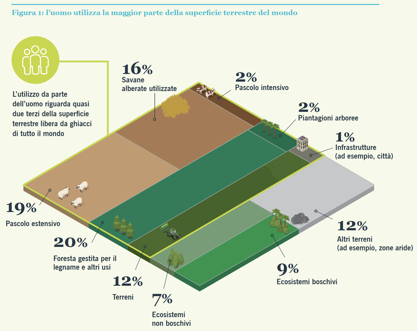 Oggi, circa due terzi della superficie terrestre del mondo sono destinati all’uso da parte dell’uomo (Figura 1), mentre gli ecosistemi naturali indisturbati rappresentano solo il 16% circa della superficie terrestre totale (IPCC Special Report on Climate Change and Land, 2019).