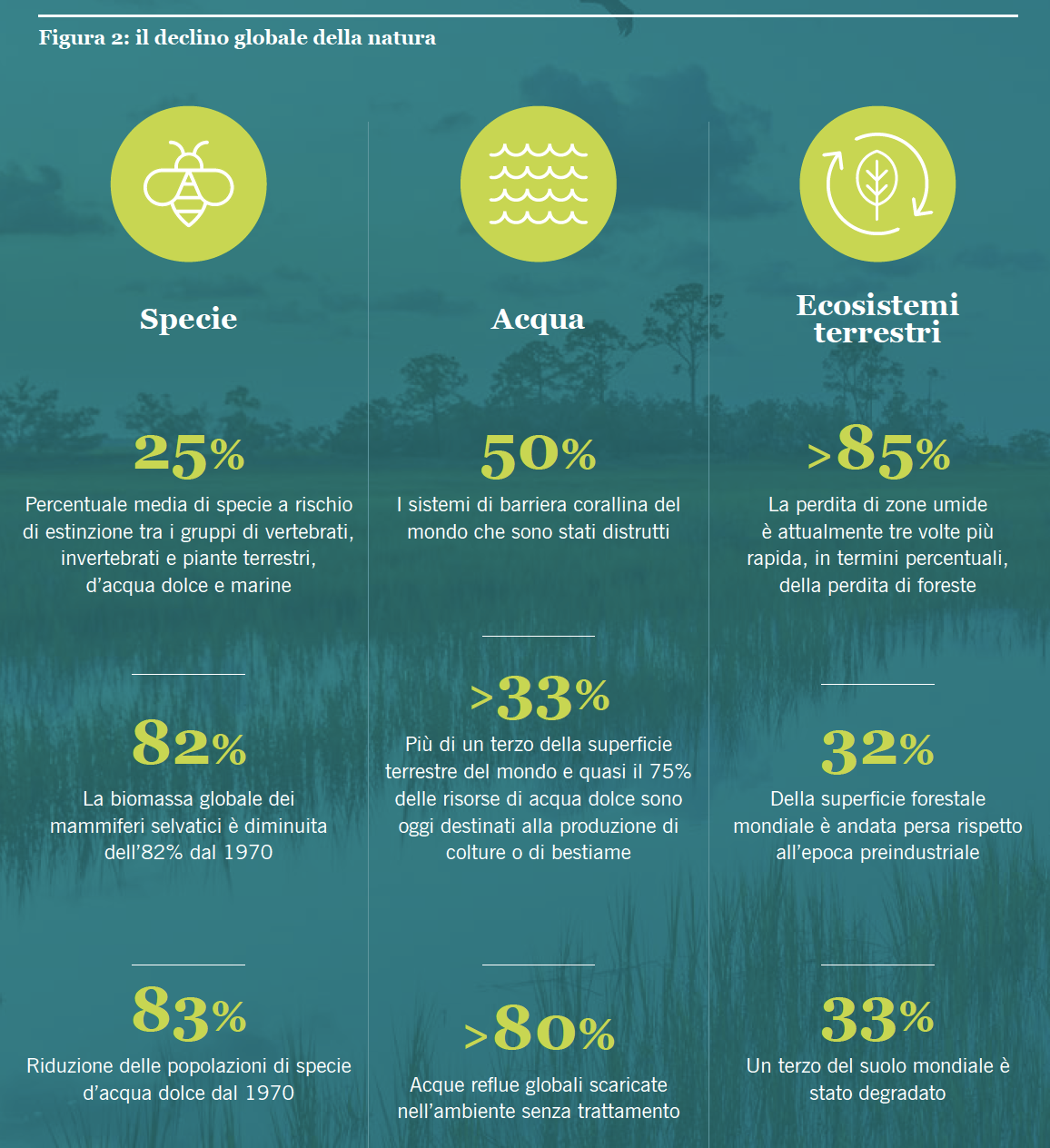 L’aumento rapidissimo dell’attività economica a partire dalla rivoluzione industriale ha avuto un impatto così enorme sugli ecosistemi naturali da mettere in pericolo oggi la capacità della natura di sostenere la società in futuro (Arrow et al. 2004; Diaz et al. 2019; IPBES 2019). La Figura 2 evidenzia alcuni degli aspetti di declino e degrado. L’esaurimento del capitale naturale ha portato a cambiamenti nella fornitura di servizi ecosistemici critici, come l’aria e l’acqua pulite, l’impollinazione, la protezione del suolo e la regolazione del clima, da cui gli esseri umani dipendono per il loro sostentamento e il loro benessere.