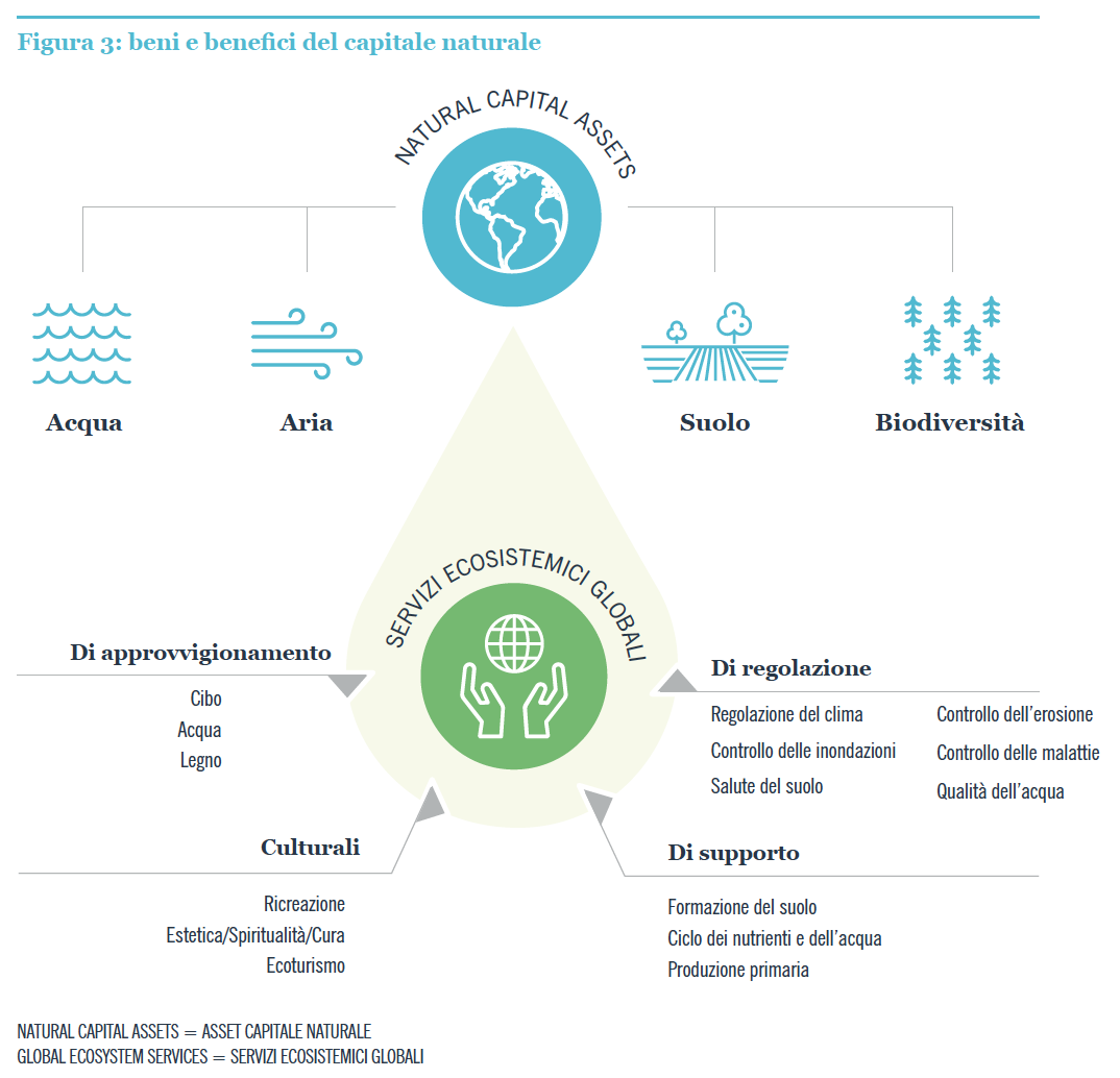 Il capitale naturale costituisce il patrimonio ecologico che sostiene l’attività economica a livello mondiale. Il capitale naturale della Terra può essere considerato come uno stock di beni (aria, suolo e acqua e la loro biodiversità) che garantisce nel tempo la fornitura dei cosiddetti servizi ecosistemici.