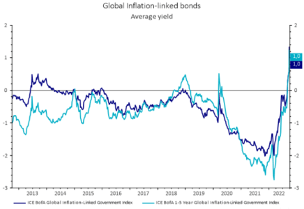 Questo è il motivo principale per cui, nonostante l’inflazione più alta degli ultimi 40 anni, la performance delle obbligazioni indicizzate all’inflazione è in calo da inizio anno. Tutte le obbligazioni indicizzate all’inflazione a scadenza, coperte in euro, sono scese del 20% da inizio anno, mentre quelle a breve scadenza, meno sensibili alla duration, sono scese solo del 4%.