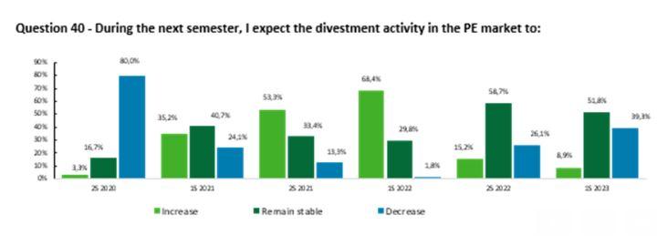 L’impatto della diminuzione dei valori attesi delle società italiane in portafoglio durante il prossimo semestre, e la conseguente erosione dei ritorni dei fondi che le detengono, spingono dunque il 39,3% dei rispondenti a credere che l’attività di disinvestimento diminuirà ulteriormente (+13,2 p.p. rispetto alla passata edizione), costringendo gli operatori a modificare il proprio approccio alla gestione del portafoglio, puntando a strategie di creazione di valore a lungo termine.