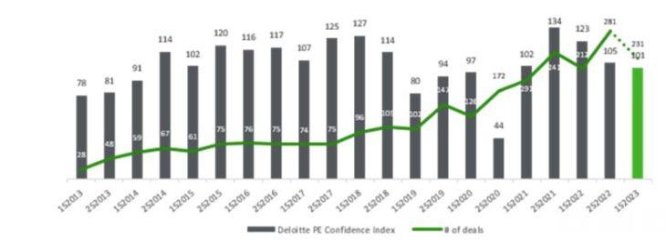 La metà degli operatori intervistati prevede per la prima metà del 2023 un panorama macroeconomico stabile, mentre scende al 44,6% la quota di chi attende un rallentamento (contro il 60,9% della passata edizione), testimoniando un approccio di prudente ottimismo nei confronti del futuro. A sottoscrivere ciò, il Deloitte PE Confidence Index per il primo semestre del 2023, sulla base dei dati raccolti nelle PE Survey condotte dalla prima edizione ad oggi, si assesta su un valore di 101 punti a cui corrisponde un numero di deal atteso pari a 231.