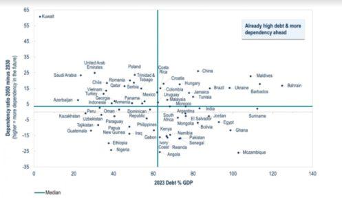 I Paesi che si trovano nel quadrante in alto a destra hanno già un debito elevato e si prevede una crescita della dipendenza in futuro, il che li pone in una situazione fiscale sempre più precaria. La Cina si trova in questo quadrante. I Paesi nel quadrante in alto a sinistra devono affrontare pressioni demografiche simili ma partono da profili di debito molto più favorevoli e, quindi, dispongono di maggiori riserve per finanziare la spesa sociale.