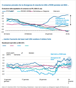 Il rafforzamento del dollaro USA è sostenuto anche da un differenziale positivo dei tassi reali rispetto al resto del mondo, ben al di sopra della media di lungo periodo. La nuova amministrazione alla Casa Bianca potrebbe avere implicazioni sia positive che negative per il dollaro. Nel complesso, tuttavia, riteniamo che il dollaro USA rimarrà probabilmente forte fino al 2025. Le politiche di Trump a favore della crescita, come i tagli alle tasse e l’aumento della spesa pubblica, potrebbero stimolare la crescita economica nel breve termine e, di conseguenza, il dollaro.