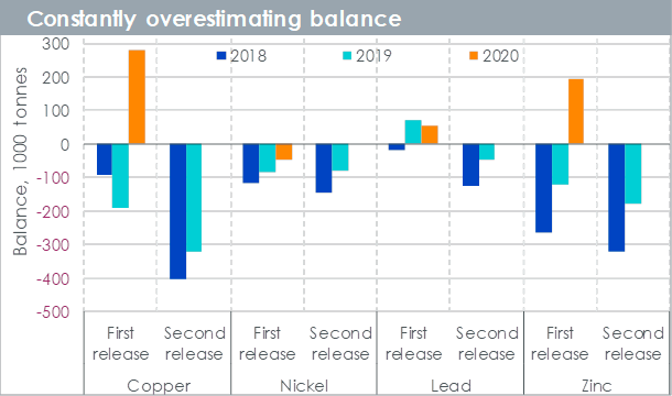 Tuttavia, se guardiamo al modello delle revisioni storiche, noi siamo un po’ scettici. Utilizzando i dati contenuti nei loro comunicati stampa, abbiamo tracciato le previsioni di bilancio tra domanda e offerta confrontando i dati tra il primo e il successivo rilascio di dati: sembra emergere un modello di significative revisioni al ribasso per tutti i metalli di base (rame, nickel, piombo, zinco). Ecco perché crediamo che sia prematuro preoccuparsi delle eccedenze di metallo.