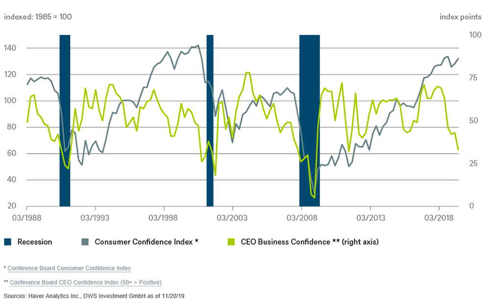Benvenuto consumatore! Dobbiamo ringraziare principalmente le famiglie se il rallentamento economico causato dai conflitti commerciali globali e la debolezza del settore manifatturiero non ci hanno ancora spinto verso una recessione più allargata. I consumatori si sono dimostrati notevolmente resilienti di fronte a una serie di cattive notizie, in particolare sul commercio globale. I sondaggi sulla fiducia dei consumatori continuano a rilevare un sentiment ottimista, che dovrebbe tradursi in una domanda da parte dei consumatori continua e solida. Al contrario, l’umore tra i top manager sembra essere molto più pessimista. In un sondaggio, i CEO giudicano la situazione attuale grave quanto lo scenario del 2011, e prima ancora quanto la grande crisi finanziaria.