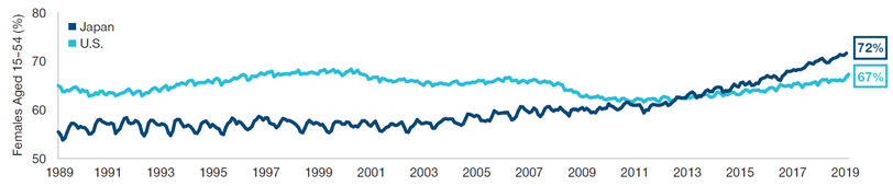 Uno dei focus dell’Abenomics è stata la revisione del contesto di lavoro in Giappone, con l’obiettivo di migliorare l’efficienza e incoraggiare gli investimenti. Sono già stati fatti notevoli passi avanti in questo ambito, con il miglioramento degli standard di governance e un nuovo framework di controllo. Al tempo stesso, un insieme di iniziative governative (leggi, politiche, investimenti in infrastrutture, incentivi per le aziende) hanno mirato ad ottenere una forza lavoro più inclusiva e dinamica.