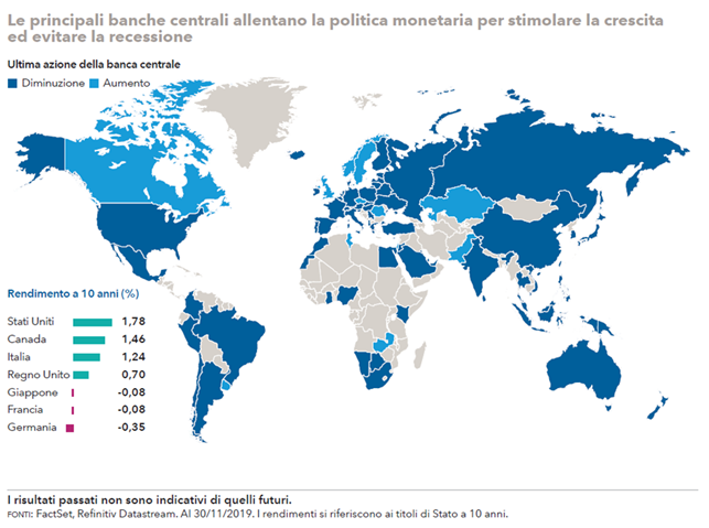 Occorre tempo affinché i tagli dei tassi di interesse facciano effetto, le misure intraprese nello scorso anno dalle banche centrali mostreranno la loro efficacia solo nel primo semestre del 2020. Resta da vedere se queste saranno sufficienti a compensare i fattori negativi che pesano sulla crescita globale.