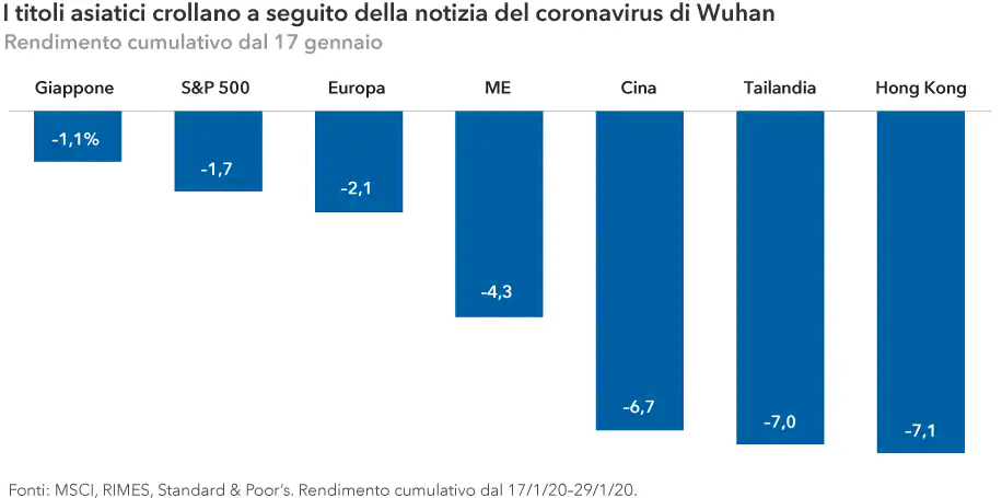 Da quando, il 17 gennaio, le notizie hanno riferito dell’esplosione del virus, i titoli dei mercati emergenti hanno perso circa il 4%, secondo le misurazioni dell’MSCI Emerging Markets IMI. I titoli cinesi hanno perso oltre il 6% e quelli thailandesi hanno lasciato sul terreno il 7%. Per contro, l’MSCI World ha perso l’1,3% nel periodo fino al 29 gennaio.