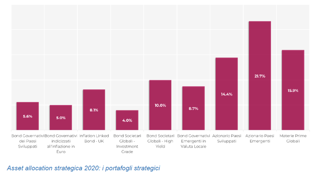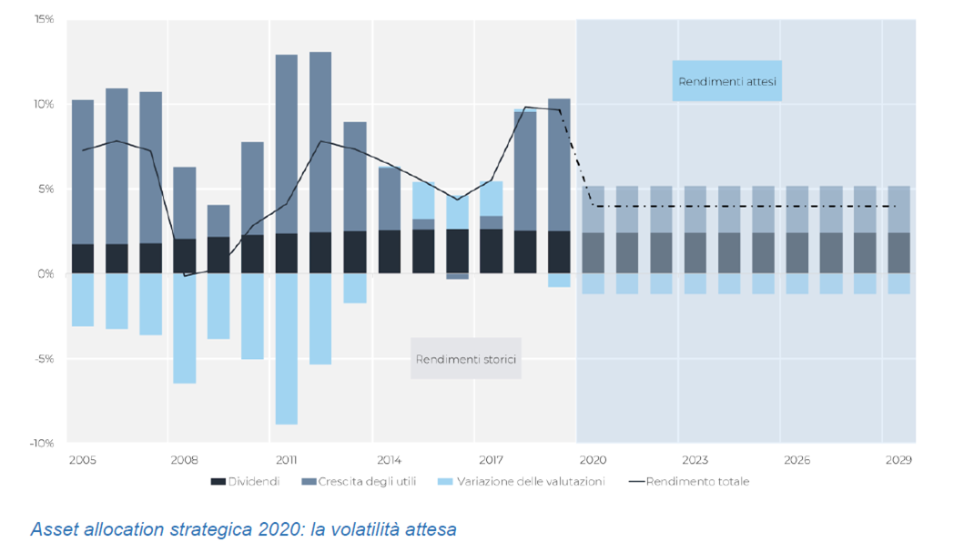 La diminuzione dei rendimenti attesi rispetto al passato è stata inevitabile data la crescita delle valutazioni registrata nel 2019 e causata, tra le altre cose, da una politica monetaria espansiva che ha ridotto ulteriormente tassi di interesse che erano già in territorio negativo. I tassi negativi hanno già cominciato a essere applicati a chi ha scelto strumenti di deposito per il proprio risparmio. In un contesto di inflazione sofferente, ma positiva (in Italia il Fondo Monetario Internazionale stima un 1,5% medio per i prossimi cinque anni), è indispensabile investire il proprio patrimonio in asset con rendimenti reali positivi, accettando un certo grado di rischio e costruendo un asset allocation adeguata al proprio profilo.
