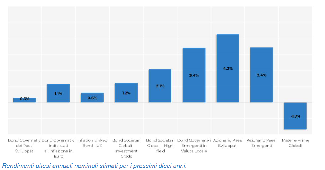 Per i prossimi dieci anni i rendimenti attesi sono positivi per quasi tutte le asset class. Dato il livello estremamente depresso dei tassi d’interesse, le asset class obbligazionarie partono svantaggiate, mentre gli investimenti più volatili, come l’azionario, potranno fornire rendimenti reali positivi e un marginale premio per il rischio. I tassi governativi scontano una politica monetaria ancora espansiva, offrendo quindi rendimenti non particolarmente allettanti.