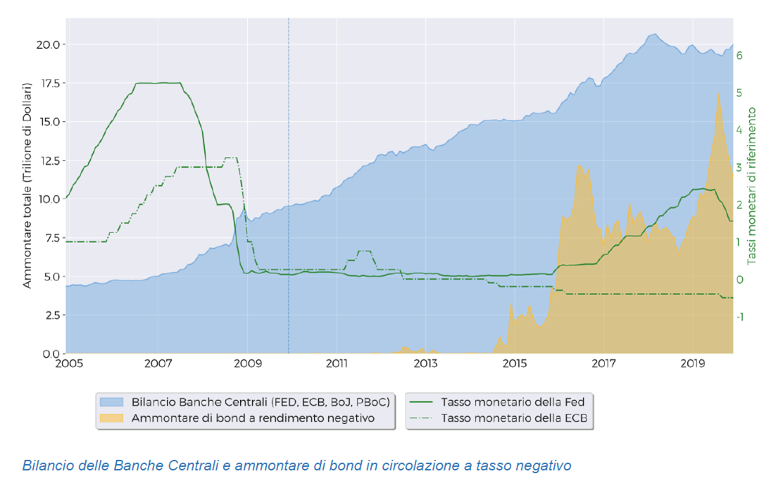 Per valutare la redditività delle obbligazioni governative si deve considerare sia il flusso cedolare (che è correlato con il livello dei tassi), sia il valore relativo dei bond rispetto ai bond emessi successivamente. Quando i tassi sono bassi entrambe queste componenti sono a rischio, sia per rendimenti minimi sia per l’alta probabilità che nel medio periodo vengano emesse obbligazioni più redditizie, andando a compromettere l’appetibilità delle obbligazioni emesse in precedenza. La politica monetaria resta il fattore fondamentale che influenza il rendimento delle obbligazioni emesse dai governi dei Paesi Sviluppati. Il 2019 è stato in questo senso un anno movimentato, la divergenza tra le aspettative dei mercati sulla crescita globale e le intenzioni di Fed e Bce sulla politica monetaria avevano portato a un crollo del mercato azionario che è stato scongiurato dall’improvvisa decisione della Fed di tagliare i tassi. Nell’arco di poche settimane si è passati da tassi d’interesse indirizzati verso il 3% a un percorso di riduzione che ha portato a tre tagli del tasso di rendimento sui depositi (per un valore cumulato dello 0,75%). Anche in Europa la Banca Centrale ha cambiato totalmente rotta. Se a inizio anno si pensava a un rialzo dei tassi prima dell’estate con conseguente chiusura del Quantitative Easing, a settembre Mario Draghi ha concluso il suo mandato con un set di politiche monetarie convenzionali che, di fatto, hanno riaperto i rubinetti della liquidità.