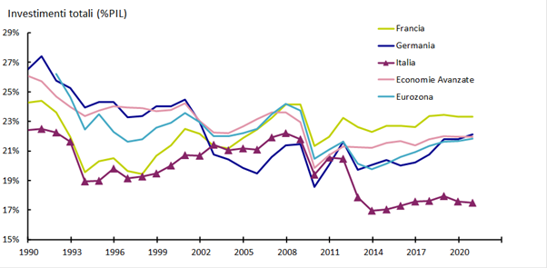 Rimane quindi un quadro congiunturale Italiano abbastanza deludente, ma il problema a mio avviso è la carenza di crescita strutturale. Il potenziale di crescita di una economia è una funzione di tre fattori: Lavoro, capitale e tecnologia. Non mi soffermo sulla traiettoria demografica e in particolare sulla popolazione in età da lavoro, che come in altri paesi – si guardi per esempio alla Germania – avrà un contributo negativo al PIL potenziale nell’immediato futuro. Consentitemi invece di insistere sulla carenza strutturale di investimenti. Il grafico evidenzia come gli investimenti (in % del PIL) siano rimbalzati dopo la Grande Crisi Finanziaria in tutte le economie avanzate censite dal Fondo Monetario Internazionale. In alcuni paesi, in Germania per esempio, ci troviamo a livelli addirittura più alti del decennio 1999-2008. In Italia, invece, gli investimenti si attestano al 17.5% del PIL, cioè 4 punti percentuali sotto il livello del decennio 1999-2008.