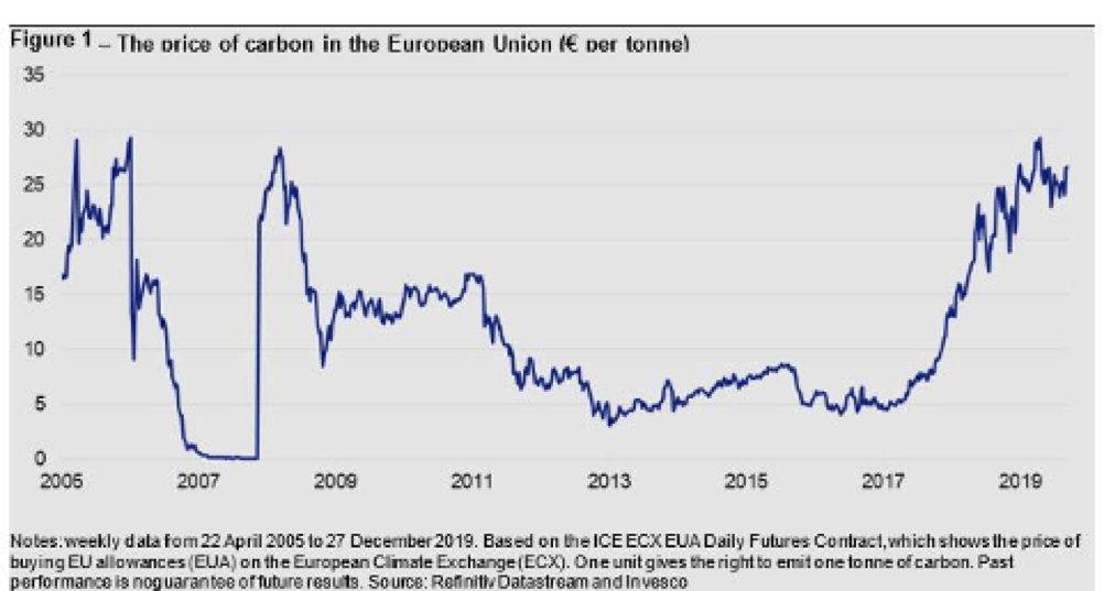 Poiché gli incendi in Australia hanno evidenziato le sfide poste dal cambiamento climatico, pensiamo che gli investitori potranno essere alla ricerca di modi per proteggere i portafogli e avere un ruolo attivo nella ricerca delle soluzioni a questo problema. Il nostro documento 21st Century Portfolio, pubblicato di recente, ha evidenziato che il problema non è nuovo (la superficie territoriale distrutta dagli incendi negli Stati Uniti è aumentata di dieci volte rispetto al 1980) e ha fornito esempi di soluzioni tecnologiche per ridurre o eliminare le emissioni di anidride carbonica. Tuttavia, il cambiamento climatico è la massima esternalità e l’internalizzazione del problema attraverso il meccanismo dei prezzi riveste un ruolo importante (a nostro parere). Il sistema di scambio di quote di emissione dell’Unione Europea è una di queste soluzioni, in cui il diritto di emettere Co2 può essere acquistato e venduto, lasciando così al mercato il compito di decidere quale sia il metodo più efficiente per ridurre le emissioni (il numero di quote si riduce nel tempo). Come illustrato nella Figura 1, il prezzo del carbonio ha faticato a superare i 30€ per tonnellata, ma riteniamo che la situazione potrebbe cambiare nel 2020.