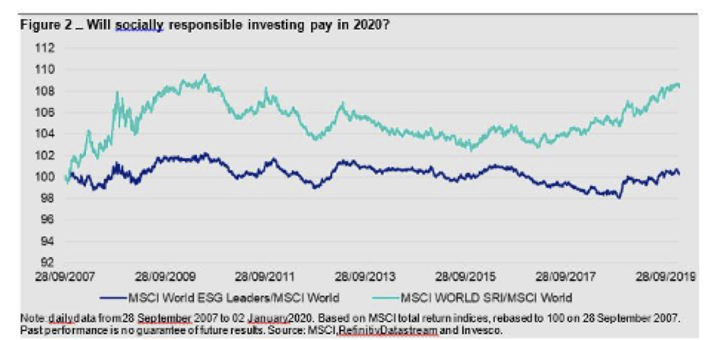 Quelli di noi che si sono interessati agli investimenti sostenibili negli anni ’80 sono rimasti delusi dalla lenta adesione all’idea da parte degli investitori e dalla conseguente mancanza di una premio sul ritorno relativo a questo tipo di investimenti. Tuttavia, il concetto più ampio di ESG (Environmental, Social e Governance) è diventato sempre più popolare ed esiste ora una serie di indici specifici attraverso cui giudicare l’efficacia di questo tipo di strategie. La tabella 2 mostra due esempi di indice MSCI, entrambi messi a confronto con lo standard MSCI World Index. Sin dal suo esordio nel settembre 2007, l’indice MSCI World ESG Leaders Index si è sostanzialmente allineato all”indice MSCI World sottostante. L’indice MSCI World SRI, più selettivo, ha meno componenti (385 contro 781 a fine novembre 2019) e storicamente si è discostato maggiormente dall’MSCI World. La tabella 2 suggerisce che il MSCI World SRI sfiora il suo precedente massimo rispetto al MSCI World, che può rappresentare un massimo (ha restituito un 13,9% annualizzato dal minimo del 16 marzo 2017 contro l’11,8% dell’indice MSCI World). Tuttavia, considerato il rinnovato interesse per gli investimenti socialmente responsabili, riteniamo che la recente sovraperformance di MSCI World SRI continuerà nel corso del 2020.