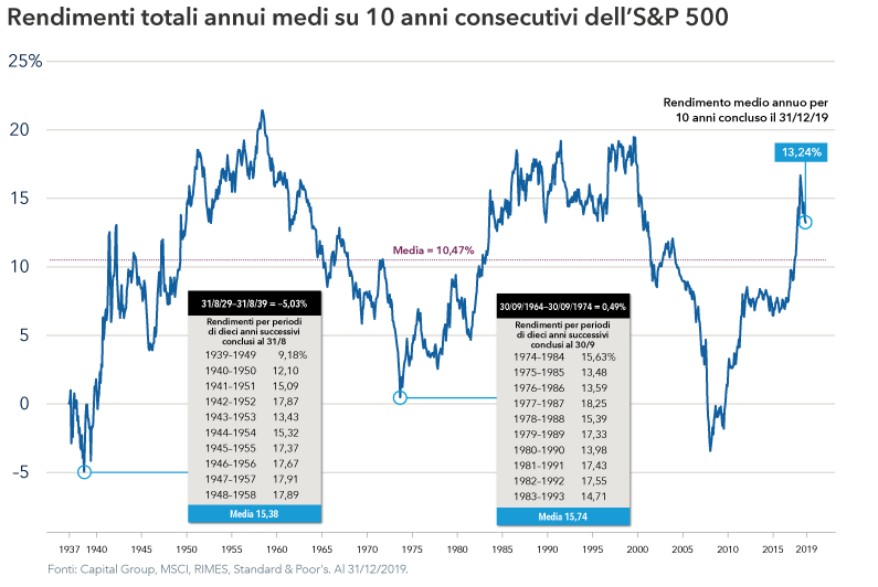 È importante mantenere sempre una visione di lungo termine, soprattutto quando i mercati sono in fase calante. Anche se le azioni salgono e scendono nel breve termine, i listini tendono a premiare gli investitori lungo archi temporali più estesi. Includendo i ribassi, il rendimento medio annuo dell’S&P 500 lungo tutti i periodi di 10 anni dal 1937 al 2019 è stato del 10,47%.