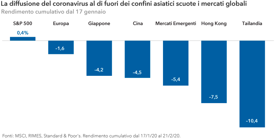 “Fino a questa settimana, il giudizio dei mercati sul coronavirus è stato relativamente benigno, ma la diffusione oltre i confini asiatici ha fatto salire il livello d’allerta tra gli investitori”, spiega Jody Jonsson, portfolio manager di Capital Group. “Il mercato sta cominciando a considerare i possibili effetti sul commercio e sui viaggi globali. Il mercato obbligazionario teme le condizioni recessive in alcune aree, tra cui Cina, Giappone e possibilmente Europa. L’impatto sull’economia statunitense è più difficile da calcolare”.