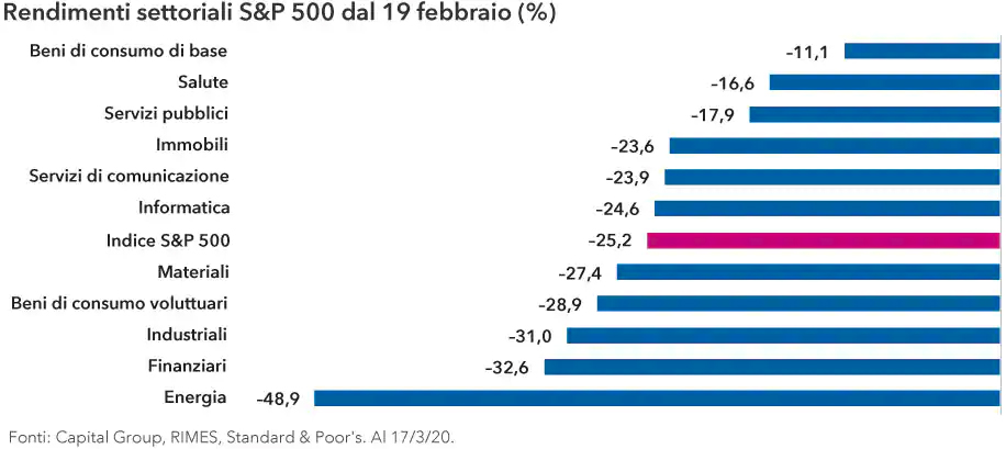 I settori dei beni di consumo di base e dei generi alimentari hanno mostrato una buona tenuta, al pari dei produttori di bevande. Il mercato immobiliare dovrebbe trarre vantaggio dall’abbassamento dei tassi, anche se il ramo commerciale potrebbe risentire dei danni potenziali alle piccole imprese. L’aumento del traffico internet è positivo per le società telefoniche e di comunicazione che beneficiano del maggiore utilizzo di dati, mentre le utility sono avvantaggiate dalla diminuzione dei tassi. Il trend positivo per i settori delle comunicazioni e delle utility è particolarmente pronunciato nei mercati esterni agli Stati Uniti.