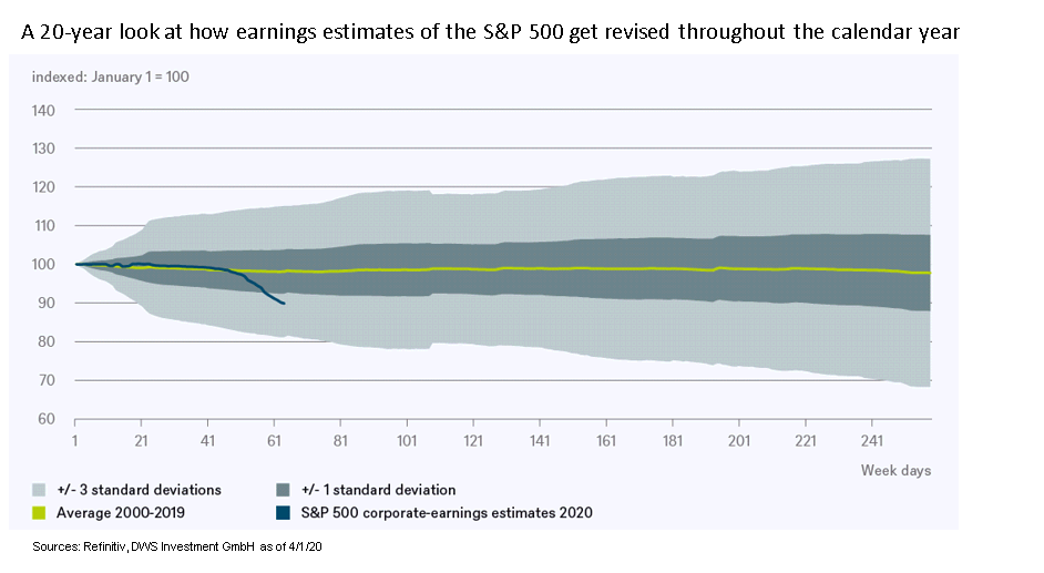 Tuttavia, la storia può offrire almeno una guida. Le consensus earnings estimates per lo S&P 500 sono state talvolta piuttosto volubili con l’avanzare dell’anno solare. Attualmente, si attestano a -10%, o poco più di una deviazione standard dal trend normale, prendendo una media degli ultimi 20 anni. Un calo di tre deviazioni standard corrisponderebbe a un calo delle stime degli utili aziendali di circa il 30%.