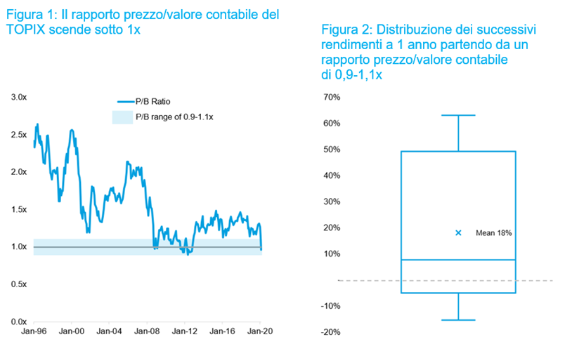 A inizio marzo abbiamo applicato questo metro valutativo ai mercati azionari per cercare di calcolare i livelli ai quali le varie regioni avrebbero raggiunto valutazioni interessanti al punto da convincerci a impiegare il nostro budget di rischio. Durante la correzione dei mercati, il Giappone si è discostato sempre più dalla media e, a metà marzo, le quotazioni sono scese al di sotto di 1x il valore contabile, raggiungendo i minimi degli ultimi 20 anni o più (Figura 1). La storia ci insegna che i rendimenti prospettici a 12 mesi di distanza da tali livelli sono sbilanciati al rialzo (Figura 2), pertanto abbiamo potenziato la nostra esposizione alle azioni giapponesi.