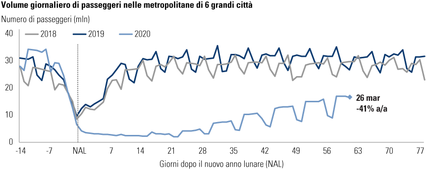 mentre il settore dei servizi e i consumi sono in ritardo sulla base dei “dati qualitativi” e degli indicatori di stima, come il traffico. La congestione del traffico nelle principali città è aumentata nelle ultime settimane, ma rimane ancora circa il 10% al di sotto della media; il numero dei passeggeri nelle metropolitane è molto contenuto, circa il 41% inferiore alla media. Ciò suggerisce che le attività e i consumi regolari non sono ancora tornati a livelli del tutto normali. Con la riapertura di centri commerciali, ristoranti e scuole, riteniamo che il traffico e i consumi miglioreranno gradualmente.