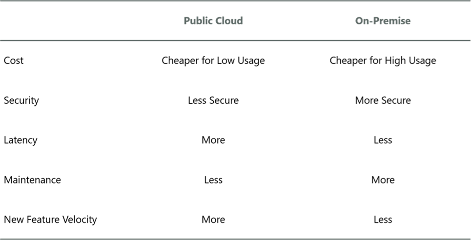 A parità di condizioni, il trade off tra servizi in cloud e on-premise varia a seconda della tipologia di lavoro, con le infrastrutture locali che sono più adatte a quei lavori che richiedono un alto utilizzo di dati ed elevati livelli di sicurezza, mentre i servizi in cloud si adattano meglio a lavori che richiedono un basso utilizzo di dati e nuove funzionalità.