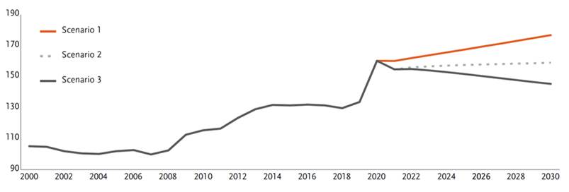 Cosa avverrà da quel punto in avanti dipende dalla crescita economica del Paese e dalla gestione del deficit. Possiamo ipotizzare tre diversi scenari: