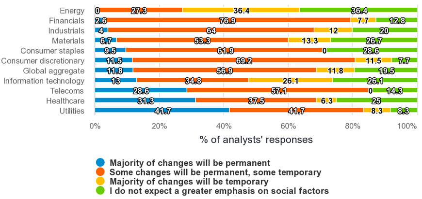 Fiona O’Neill ha aggiunto: “Il cambiamento più significativo, come riportato il mese scorso, è stata la maggiore attenzione alle questioni sociali. Questo mese, l’indagine ha rilevato che questa tendenza durerà più a lungo dell’epidemia di Covid-19 in alcune aree. Il 15% degli analisti in Nord America, una percentuale più alta rispetto all’Europa, ha dichiarato di aspettarsi che la maggior parte dei cambiamenti orientati al sociale nelle aziende sarà permanente”.