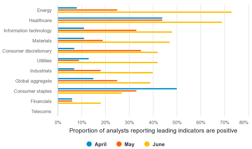 Il settore energetico ha visto il miglioramento più significativo in termini di prospettive, trainato dalla stabilizzazione del prezzo del petrolio, con il 73% degli analisti che copre questo settore che ha segnalato che i principali indicatori sono positivi, in crescita rispetto ad appena l’8% di due mesi fa”.