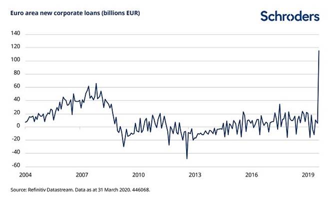 Il risultato di queste misure di supporto è che le banche hanno mantenuto i rubinetti aperti, anche se in tempi incerti avrebbero normalmente tagliato l’erogazione di credito. Solo a marzo, i nuovi prestiti alle aziende nell’Area Euro sono stati pari a $115 miliardi, un aumento senza precedenti. Sebbene in gran parte si tratti di prestiti a breve scadenza, anche quelli a 5 anni o più hanno visto una crescita record. Se le banche saranno in grado di mantenere la qualità dei prestiti invariata, erogando denaro invece di pagare interessi alla BCE per i depositi, gli effetti sulla profittabilità dovrebbero essere positivi.
