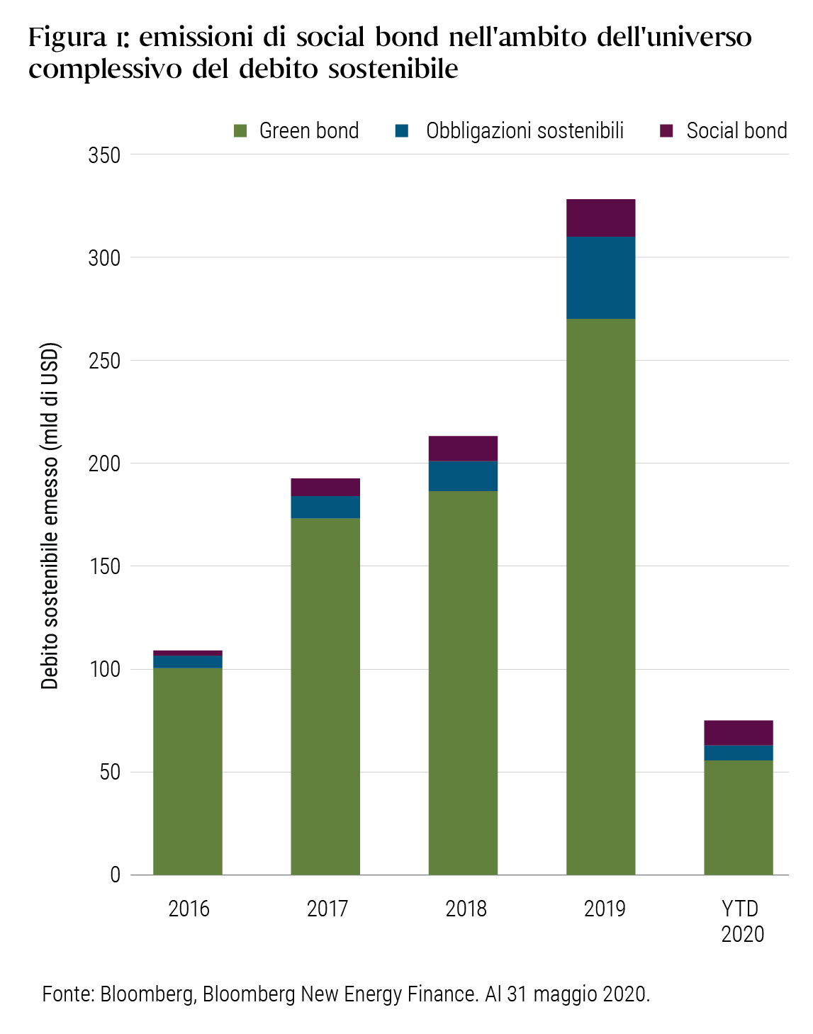 Quest’anno l’emissione di social bond ha già fatto segnare un record, con un totale di oltre 20 miliardi di Dollari raccolti per progetti sociali a livello globale. Vista la maggiore attenzione rivolta alle questioni sociali, a seguito del COVID-19, ci aspettiamo un aumento significativo delle emissioni di social bond (e di obbligazioni sostenibili, che comprendono aspetti di sostenibilità sia ambientale che sociale) (cfr. Figura 1). I social bond credibili e ben strutturati sono un’opportunità di mercato unica nel suo genere per gli investitori per finanziare soluzioni economiche e sanitarie di cui c’è urgente bisogno.