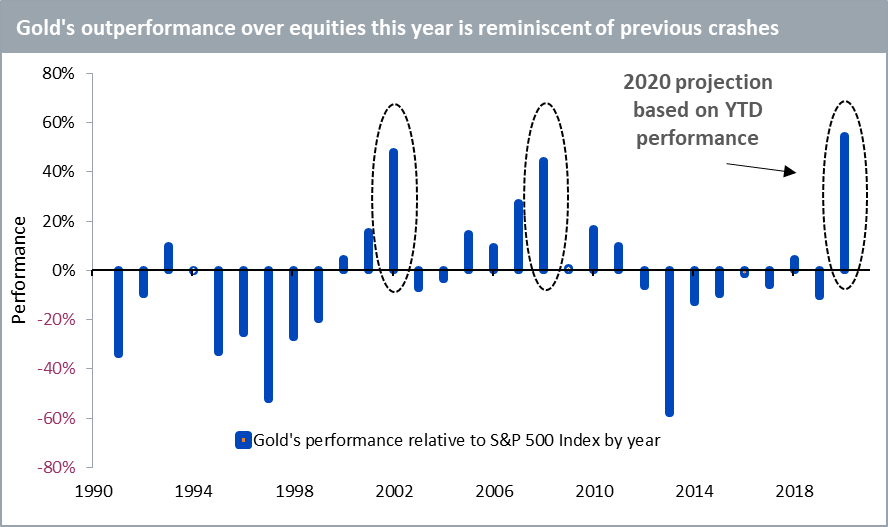 Vediamo, tuttavia, che l’oro si afferma come opzione put – e questa non è la prima volta. Dopo i precedenti crolli dei mercati azionari – in particolare il crollo delle dotcom e la crisi finanziaria globale – l’oro ha fortemente sovraperformato l’azionario. In questo caso, la ripresa delle azioni – in modo apparentemente controintuitivo – va nella stessa direzione dell’oro. Ed è così, infatti, dal marzo di quest’anno.