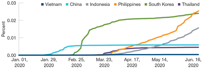 Ad oggi non sono state registrate vittime per coronavirus in Vietnam e il tasso di contagio sembra essere sotto controllo. Secondo il nostro modello di analisi, il Vietnam è tra i Paesi di Frontiera ed Emergenti in cui il virus è stato controllato meglio, e ha mostrato una gestione migliore anche rispetto ad altri Paesi più ricchi, come Germania o Corea del Sud.