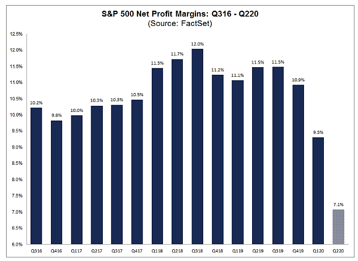 Da un paio settimane è cominciata la stagione delle trimestrali che rappresenta, in particolar modo quella attuale, un momento cruciale per gli investitori, in quanto i danni della pandemia si vedranno concretamente riflessi sui bilanci delle aziende. Il 2020 sarà un anno storico, in quanto le stime del crollo degli utili sono preoccupanti ed il grafico sottostante ne è una chiara rappresentazione: il margine di profitto complessivo che, secondo le attese, sarà generato dalle società che compongono l’indice azionario S&P 500 risulta pari a 7,1%, ovvero il valore più basso da oltre una decade.