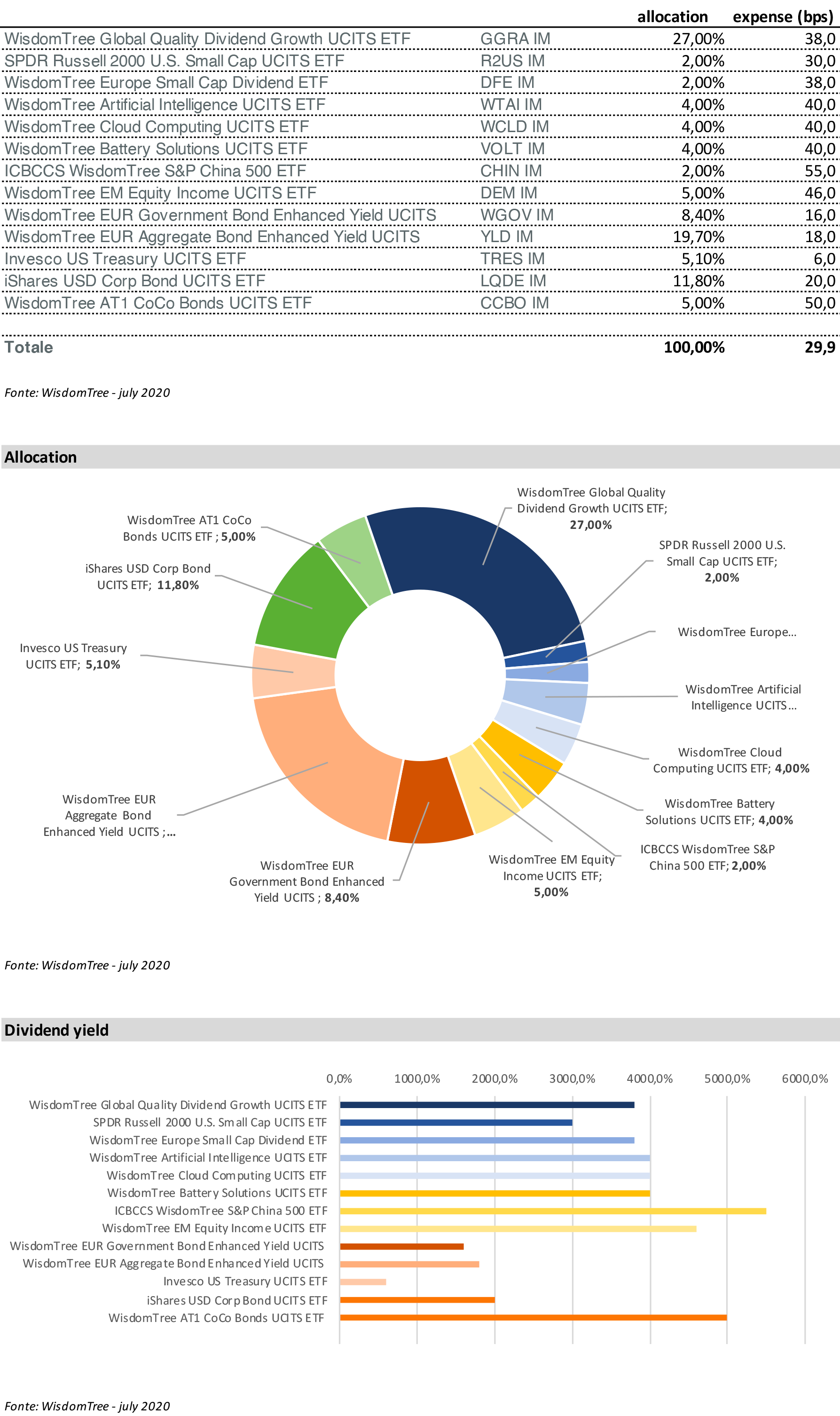 fonte: WisdomTree – Thematic Model Portfolio 50% Fixed Income / 50% Equity Presentation – dati ad luglio 2020