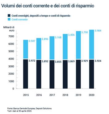 Nel 2015 gli europei avevano depositato il 39% del loro denaro su conti correnti (2.547 miliardi di euro). Al 2020, questa cifra è cresciuta quasi del 50% (3.984 miliardi di euro). E mentre il volume dei conti correnti è aumentato, la quantità di denaro depositato su conti a tempo determinato, conti di denaro overnight e conti di risparmio, è rimasta invece stabile negli ultimi 5 anni (3.972 del 2015 vs 3.924 del 2020).
