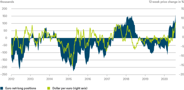 Sulla correzione del dollaro ha inciso inoltre il posizionamento: a inizio anno molti partecipanti al mercato dei future si erano posizionati per un indebolimento dell’euro, come mostra il nostro Grafico della settimana, ma con l’euro più forte anche il posizionamento è cambiato. Attualmente, le speculazioni su un’ulteriore debolezza del dollaro hanno raggiunto livelli che non si vedevano dal 2018.